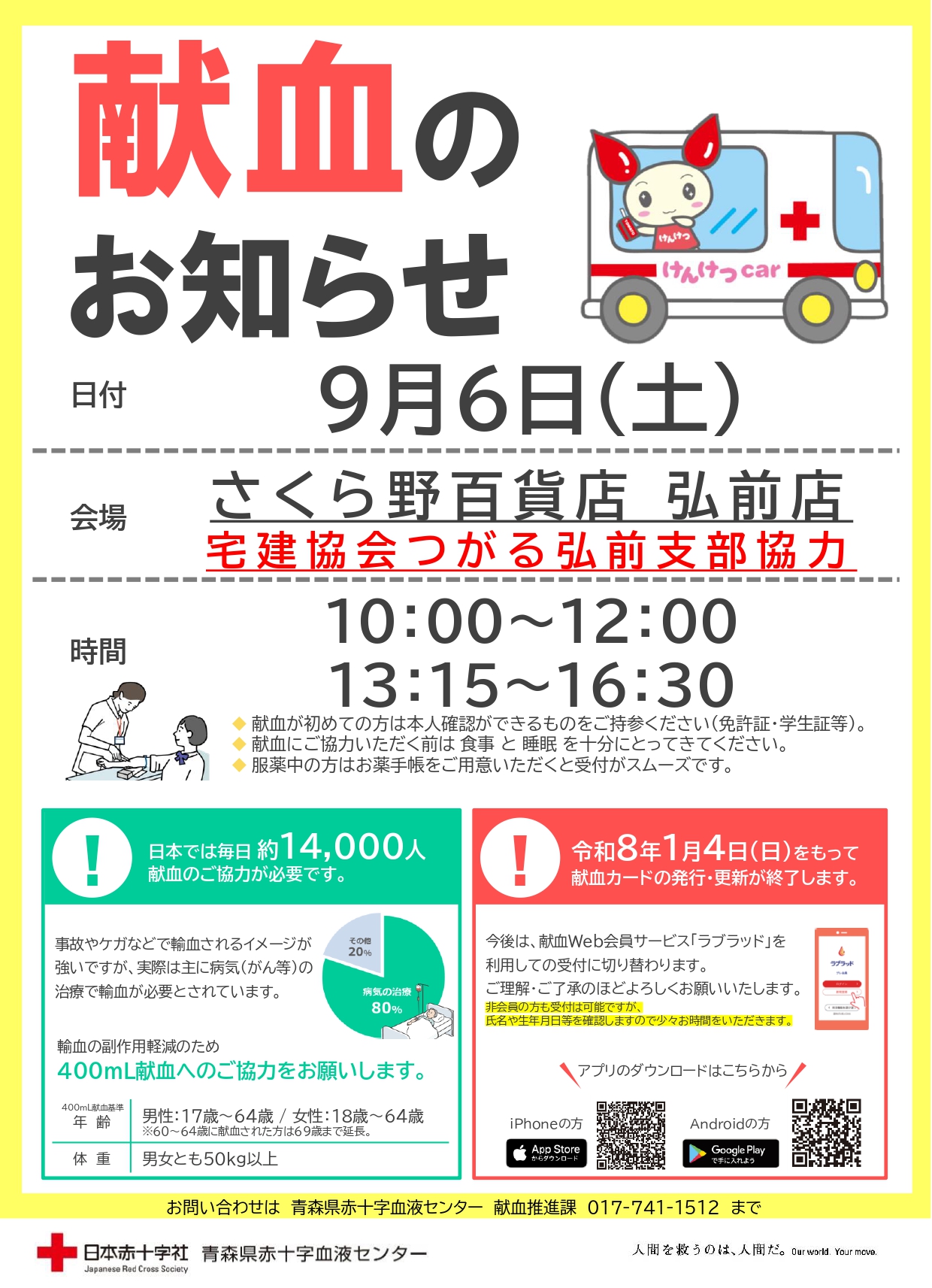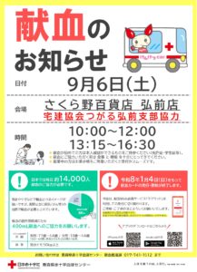 令和7年9月6日(土)さくら野百貨店弘前店の正面で献血活動を行います!!